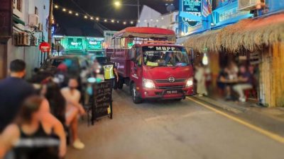 (槟城14日讯)尽管多次警告及开出罚单,牛干冬及爱情巷部分商家仍然占据五脚基及马路摆设桌椅,槟岛市政厅昨日展开取缔行动,充公多个桌椅及直立式广告牌。