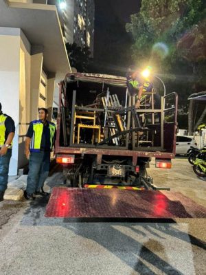 贴文说,有关行动在晚上8时30分展开,共有13名官员参与。市政厅共充公44件物品,包括29张椅子、10张桌子、5个广告牌。