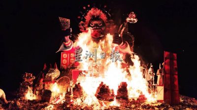 该会理事、庆委会成员、信众,以及义务工作人员昨晚9时许在临时坛前聚集,理事会成员于晚上约10时45分,在法师带领下诵经膜拜,过后将高19呎的大士爷纸扎金身扛到临时神坛后方的空地,再一番的诵经膜拜后于晚上11时38分点火焚化。
