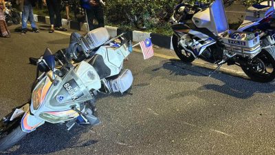 (浮罗交怡27日讯)摩托车巡逻队(URB)1名警员巡逻期间,为了闪避撞上一只突然冲出马路的狗狗而急刹车,导致摩托车失控翻覆,巡警也因重摔在马路上受伤。