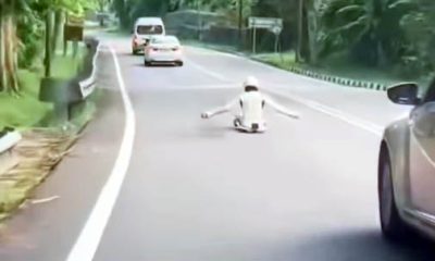这名男子是在敦沙顿路(浮罗山路)的下山路段,仰躺或坐在滑板上滑行,只见他的前后都有车辆,尾随在后的摩托车骑士拍下视频并上传至社交媒体后引起热议,网民要求警方采取行动,也有人问:“那是成龙吗?”