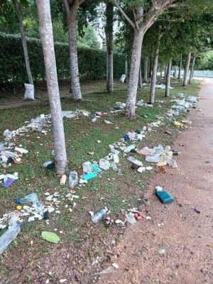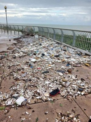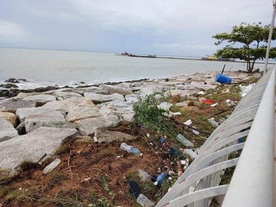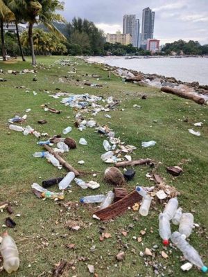 脸书专页Penang Kini 早前分享网民的照片,显示槟城海峡岸广场一带的休闲公园及步道,覆盖了许多垃圾包括塑料垃圾、塑料瓶子等,甚至还有鞋子也被冲上岸。