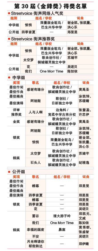 (槟城23日讯)槟城锺灵独立中学在北工站主办的第30届《金锋奖》全国创作歌曲观摩赛中学组,以一曲《感谢有缘分》拿下金奖、最佳作词、最佳作曲大奖;公开组歌手郑旻旻以一曲《帷幕》横扫银奖、最佳作词、最佳作曲、最佳编曲、最佳演绎,双双成为两组别的大赢家。