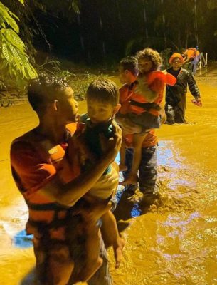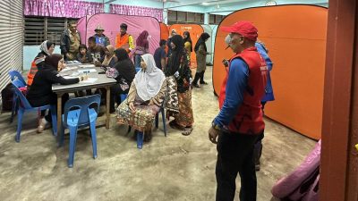 (华玲1日讯)连续数小时暴雨导致华玲县多个村庄发生内涝,其中,甘榜惹南(kg Jernang)与丹绒巴里(Tanjng Pari)62户家庭,共134个灾民连夜迁至当地4个疏散中心避难。