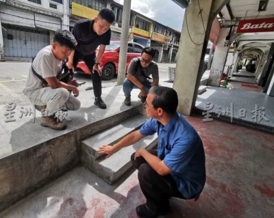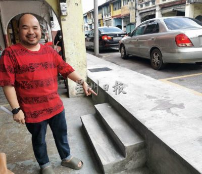 (大山脚1日讯)大山脚拿督余水清路(大街)盖沟渠打造人行道工程,造成一些商店走廊与人行道出现高达19吋高度的差距,尽管建了2级的阶梯,但商家要求为了方便老人家、行动不便者和民众的安全,阶梯旁最好安装扶手,更好是能建设残障人士友善坡道,方便坐轮椅的障友进出商店和商家上下货。