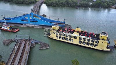 (北海3日讯)改造为博物馆的槟城标志性渡轮“槟城号”,今午1时22分从北海峇眼达南船台,拖曳穿越过铁道公司平转桥,以开启新的篇章。