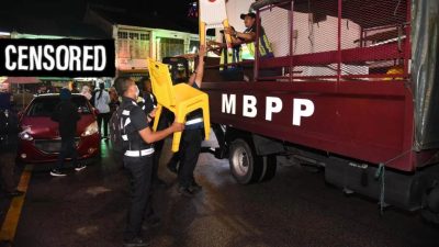 (槟城9日讯)槟岛市政厅到爱情巷及牛干冬一带展开取缔行动,充公2家店面摆放在路旁及五脚基的桌椅及物品。