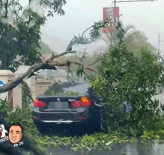 (槟城25日讯)今日的一场大风大雨,槟岛州清真寺路肯德基快餐店前一棵路边大树轰然倒下,正正压中一辆宝马轿车,所幸没造成人命伤亡事故。