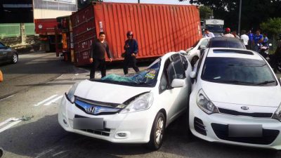 他说,警方于上午9时30分接获公众投报上述交通事故后派员赶往现场,初步调查显示案发时有5辆轿车和1辆卡车停在哥本西烈路红绿灯前,1辆牵引车从武吉丁雅路左转进入哥本西烈路时,后方挂车上的集装箱失衡倒下,2辆轿车被压中后擦撞另外3辆轿车和1辆卡车。”