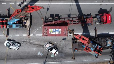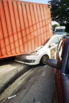 (大山脚13日讯)一辆重型牵引车于行驶途中转弯时,集装箱失衡从挂车倒下,砸中两辆正在等待红灯转绿前的轿车,导致其中一辆轿车内的女子被压死。