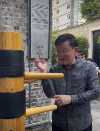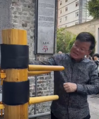 目前人在中国广州的槟州首席部长曹观友,他昨日到中国广州荔湾区的李小龙祖居,看到咏春拳木人桩,一时兴起耍了拳法。