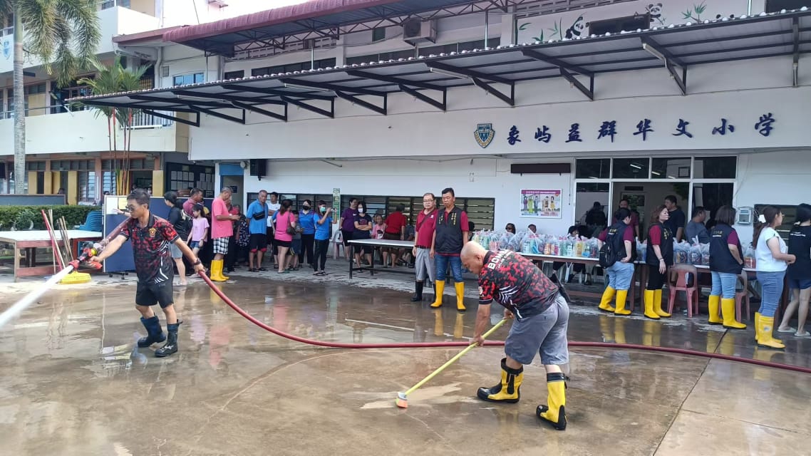 随着该校的水位消退后,惹兰君乐义务消防队、教师和没受到水灾影响的家长、学生和校友们今日纷纷回到校园,协助进行灾后清理工作。