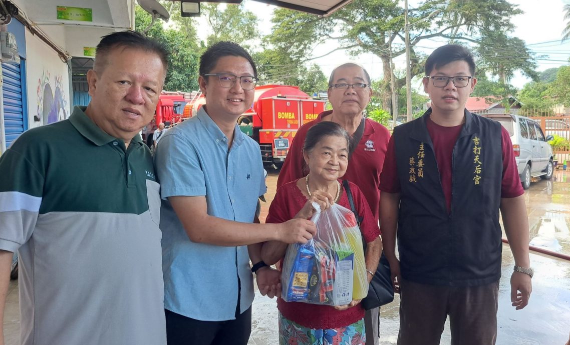而哥打达鲁阿曼州议员郑瑞隆、助理马宝庆和吉打天后宫神务顾问蔡科洋等人当场分派物资给灾民。