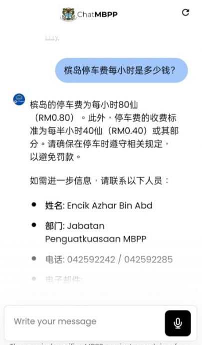 市政厅聊天机器人顾问陈来发也说,该机器人是以ChatGPT4.0为基础模板,它会在其知识库里寻找答案并给予精准的答复。