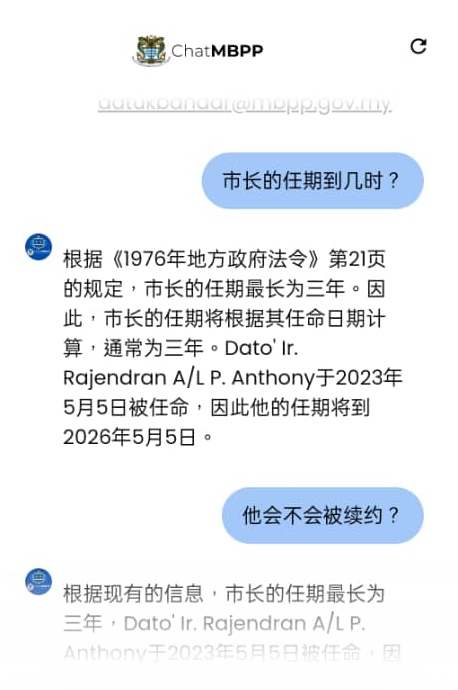 槟岛市政厅今日推介人工智能聊天机器人(ChatMBPP)1.0测试版本,记者询问该机器人关于市长任期的问题时,获得以上的答复。
