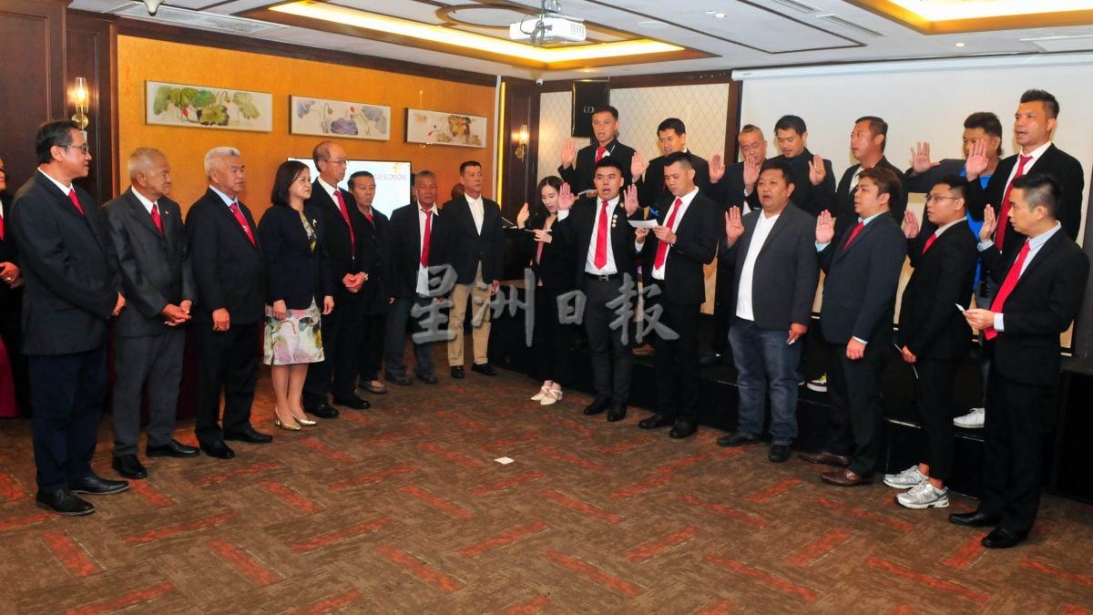 北马渤海堂高甘吴宗祠第十三届青年团宣誓就职,吴松兴(左起)、吴棋煌、吴清辉、吴秀丽、吴文君、吴德水、吴德扶和吴春锦监誓。(洪东凯摄)