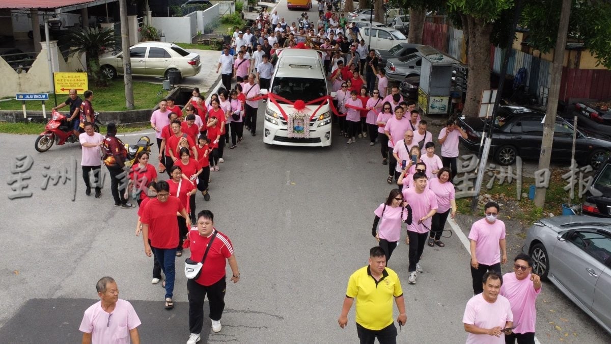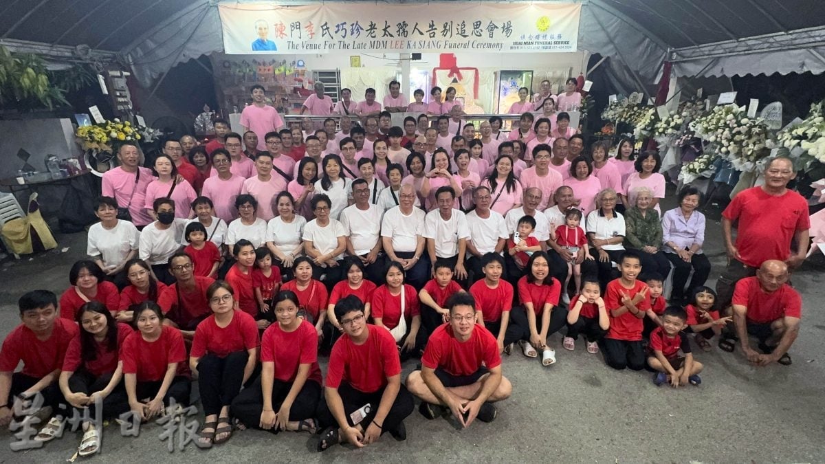 (槟城30日讯)生前五代同堂的柔府村最年长居民李巧珍今天举殡,参与喜丧告别仪式的后辈近200人,约50名穿上粉红及红衣的孙辈以“拔龙须”形式送别老人家。