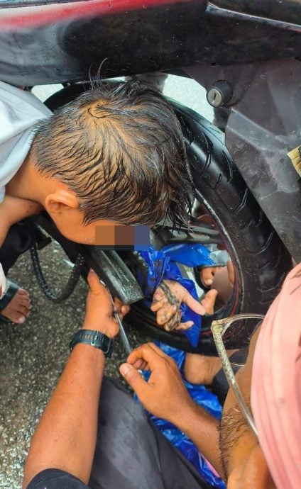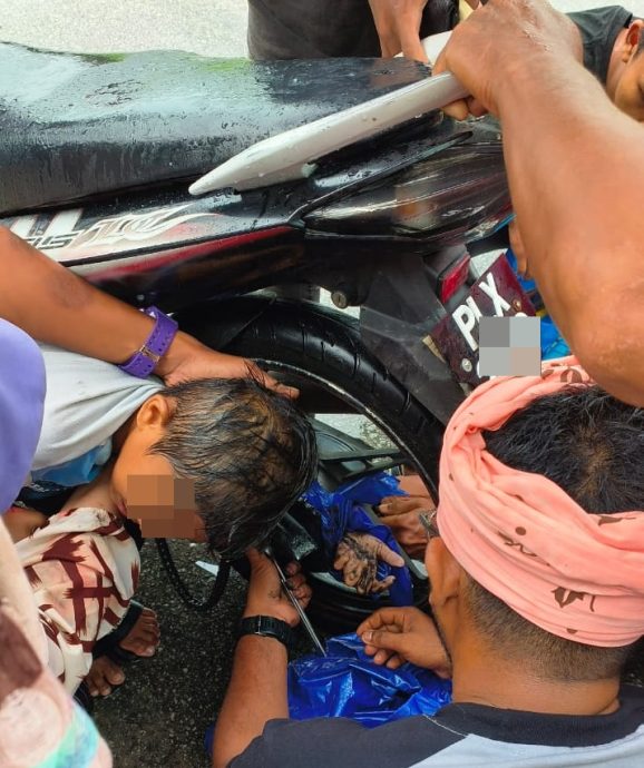 (槟城5日讯)男童穿,却被后轮夹住雨衣,导致他左手被卷入(spokes)内,痛苦不堪。