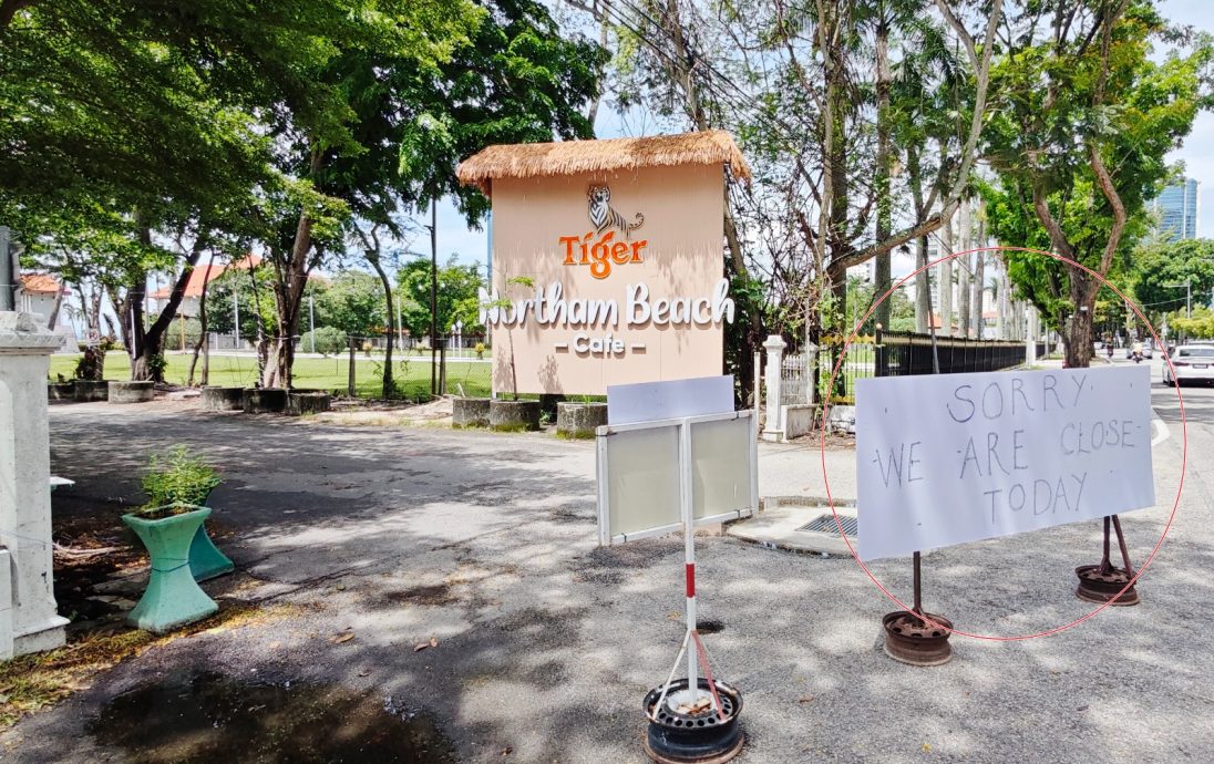 (槟城11日讯)诺登美食坊(Northam Beach Cafe)今早遭遇暴风雨,屋顶渗水严重,导致石膏天花板吸水后膨胀碎裂而掉落,满地都是碎石膏。