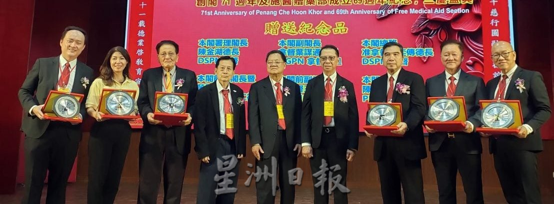 会上也赠送纪念品给荣获槟州元首赐封勋衔的紫云阁署理阁长陈金湖、副阁长拿督叶谋通、总务锺奕传、前副阁长周俊仁、前副福利股长王宗裕、教育股长陈建文。