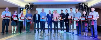 大会颁发纪念品给服务超过10年的讲师及带教医师、国州议员代表和赞助商,左五及七为黄峇福及洪亚福;右五是沈晓勇。(李明慧摄)