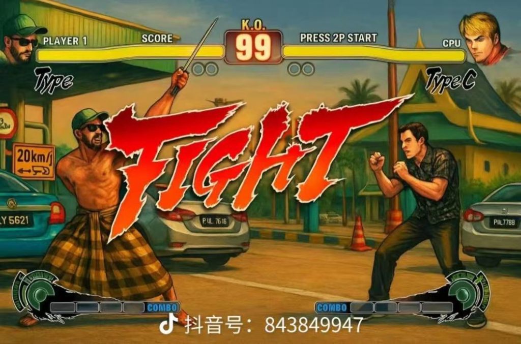 根据网传的视频,一名裸上身的巫裔男子手持棍状物,并摆出马来武术的姿势,企图攻击华裔男子,后者则摆出防御手势,被网民戏称是“马来武士”大战“黄飞鸿”。