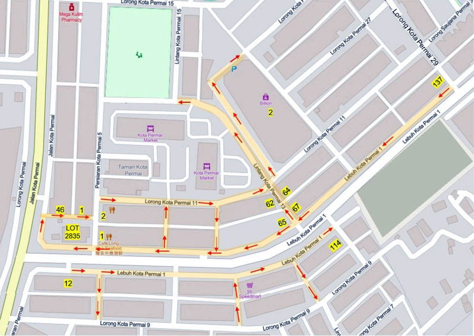 陈润辉说,涉及改道计划的主要路段共有7条,包括两条是早已实施单行道的林当百利镇13(Lintang Kota Permai 13),以及百利镇万顺购物中心前的辅路(Jalan Servis)。
