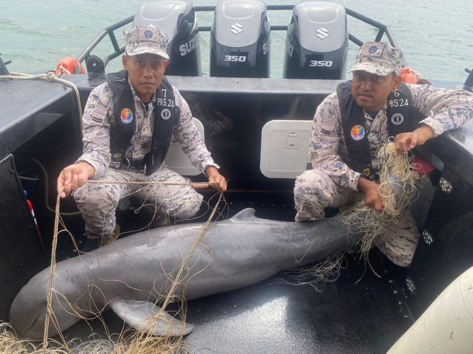 (亚罗士打21日讯)濒临绝种的短吻海豚(Irrawaddy dolphin)因误入非法拖网工具(Pukat Pari),被网缠住后不幸死亡。