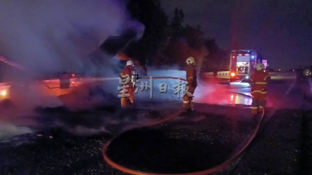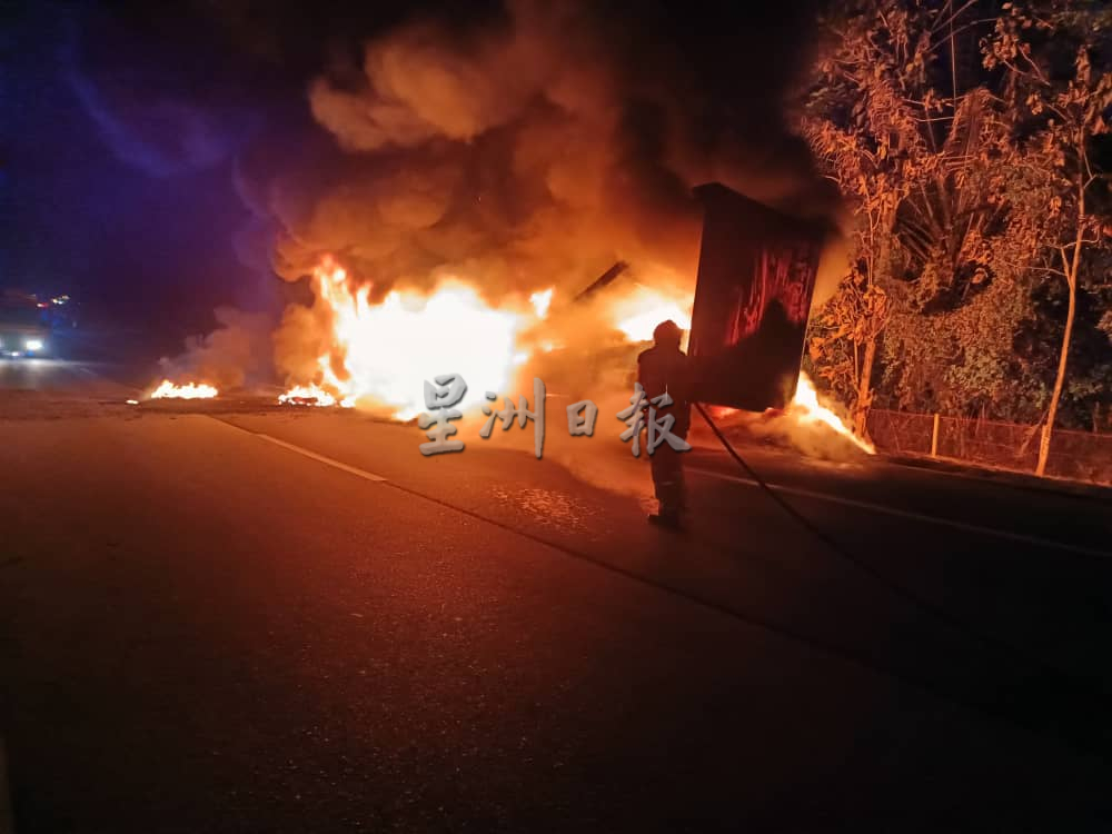 上述火患是于今日凌晨3时许,在南北大道双溪赖通往北部方向的123.4公里路段发生,当局初步估计,货柜罗里约有80%被大火烧毁。
