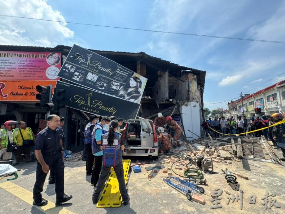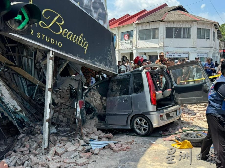 这起事件于今午1时50分,发生在北海老桥路口。由于被撞的两间店屋为歷史悠久的战前建筑,结构老旧,在遭轿车猛烈撞击后,前方墙体瞬间倒塌,现场一片混乱。