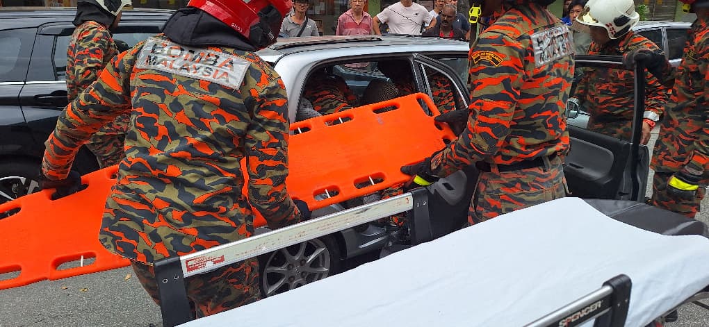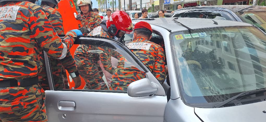 (槟城8日讯)75岁妇女驾车突然失控撞向路旁汽车,她在司机座上,消拯员破门救人,被救出的老妇呼吸微弱,已被送院抢救。