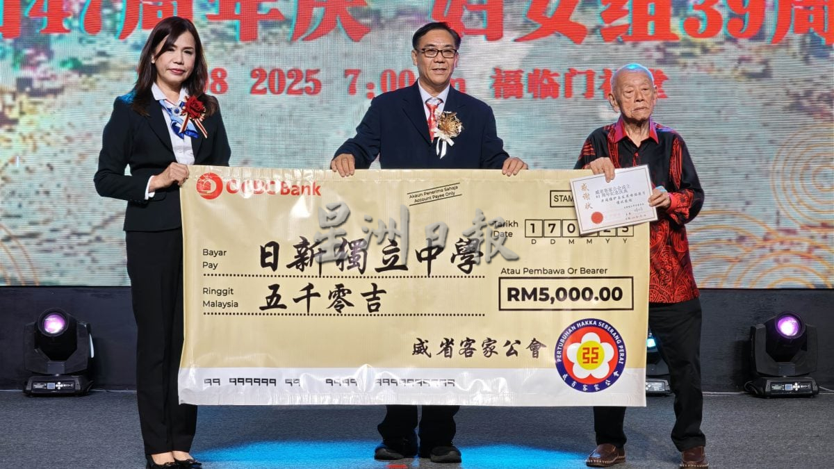马来西亚客家公会联合会总会长拿督贝建安和工委会主席傅映也于宴上致词,后者与威省客家公会财政黄芮姿移交5000令吉献金给日新独立中学,由该校董事拿督斯里王振祥代表接领。