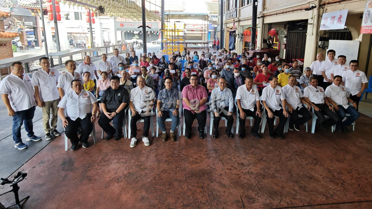 大山脚埠众盂兰胜会分发病黎慈善基金给63名受惠者,坐者右起是彭玟贵、陈顺来、周佳秋、江炳荣、彭荣钦、刘子健、黄伟良、曹志椗、李金峰、陈亮宏及理事赖炳辉。(洪东凯摄)