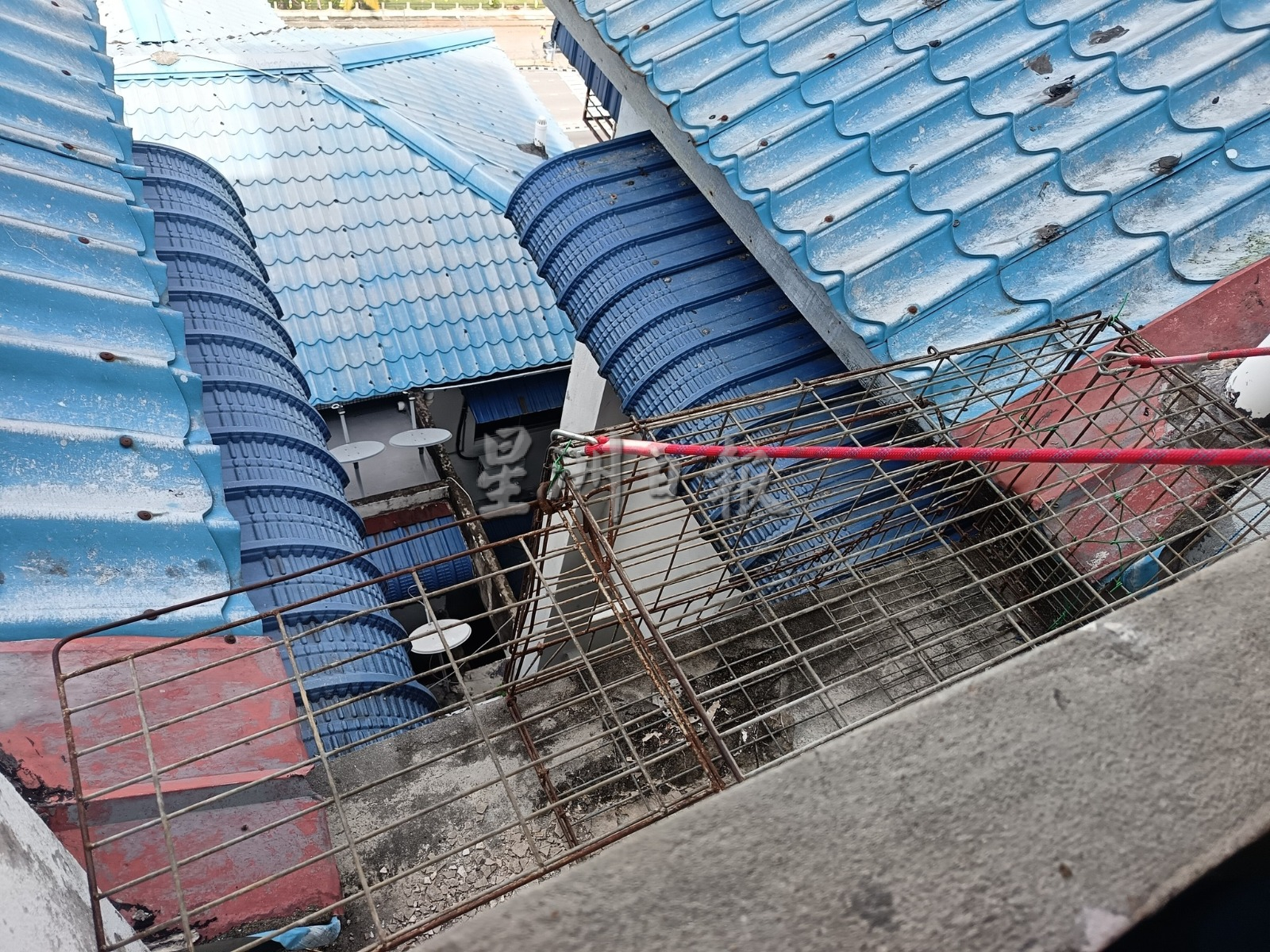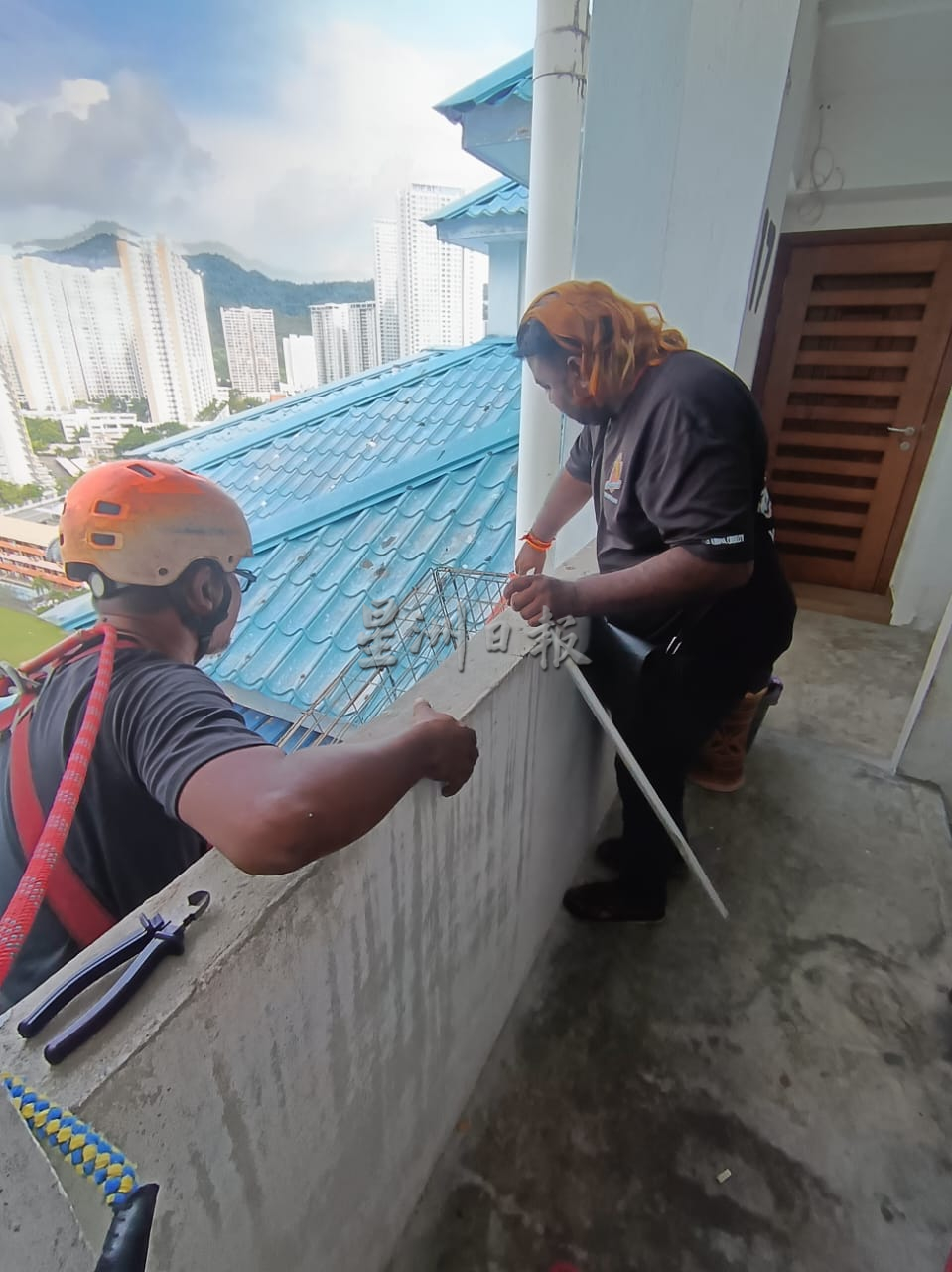 (槟城25日讯)受困在公寓17楼挑檐上第6天,三大种族的爱狗人士,今日携手在安全之处安装狗笼,希望能诱导灰狗进入狗笼,从而获救。