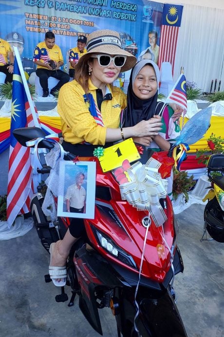 欢乐跑幸运儿在抽获摩托及电动摩托后与大会赞助人郑鶠合摄。