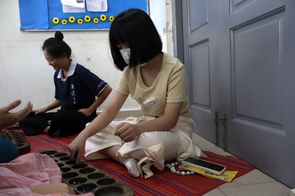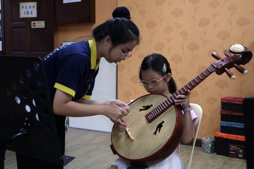日新独中的学生耐心提导小学生弹拨中阮。(图:日新独中)