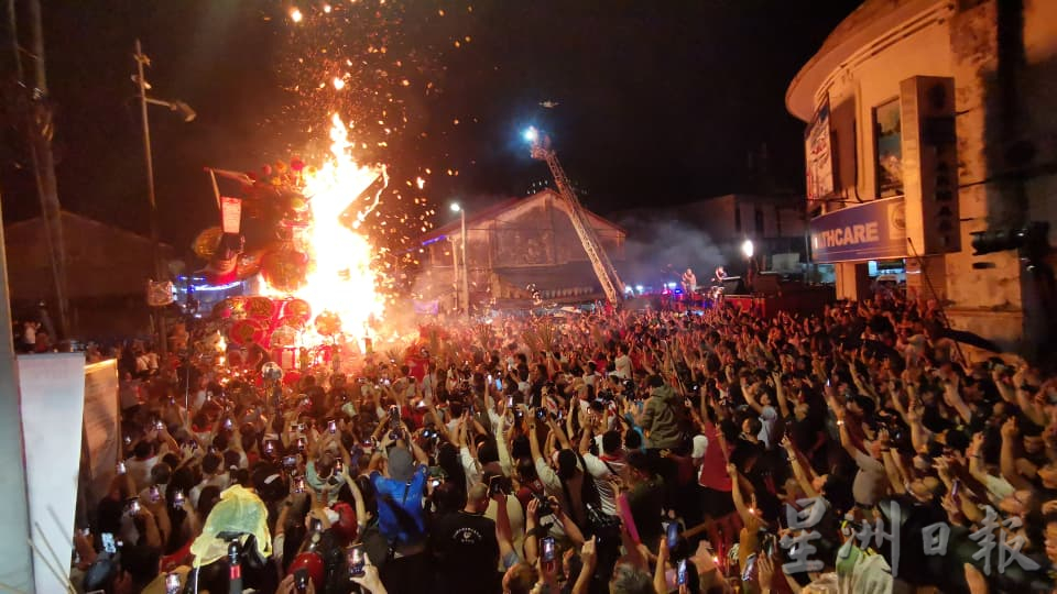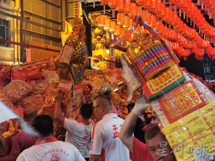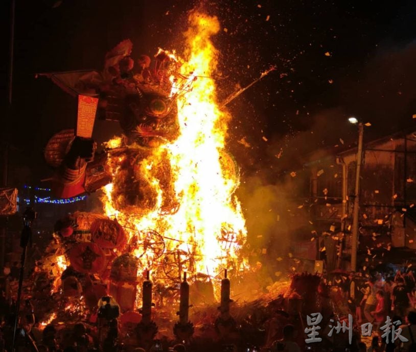 (8日讯)全槟甚至是全马最具代表性的大山脚埠众盂兰胜会庆典,今晚在细雨中随着恭送纸扎金身回銮,金身要焚化时雨停了,仪式圆满结束了15天的庆典。