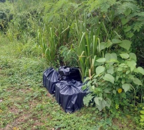 私枭从“老鼠道”走私啤酒、烈酒入境后,藏在洋麻园草丛旁。(警方提供)