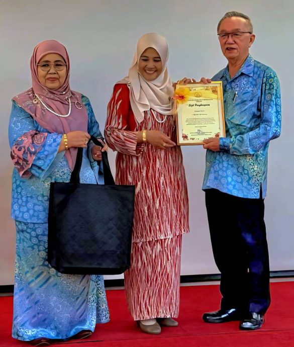 罗斯娜沙迪(中)颁赠长期社会福利服务有功贡献奖给陈良成(右),玛丝迪卡(左)陪同见证。(图:峇冬丁宜安老院)