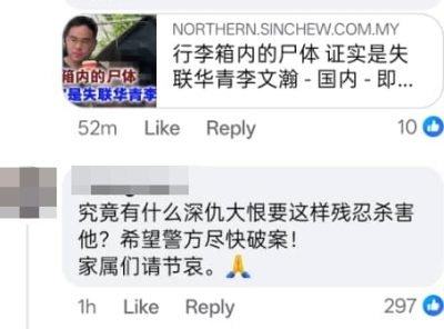 失踪两天的李文瀚,最终被发现藏尸于行李箱内,许多网民及友人都在社交媒体上表达哀悼,并希望警方彻查。