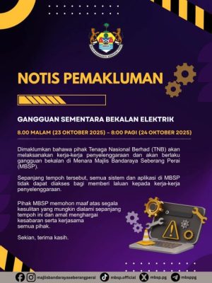 (大山脚23日讯)威省市政厅(MBSP)今日发出通知,由于国家能源公司(TNB)将于今晚进行电力维护工程,届时市政厅大厦将面对暂时性的电力供应中断。
