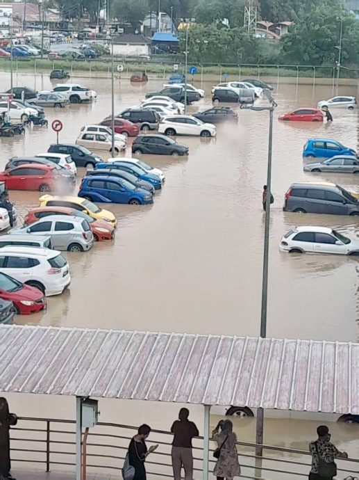 亚娄王城火车站的停车场积水,水深1至2呎,停在较低处的车辆已被水浸,摩托车也泡在水中。火车站管理层业也于昨晚8时,宣布关闭停车场。