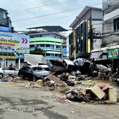 今次洪灾淹没许多汽车,洪水消退后,合艾街头可见许多已损坏的汽车(取自社交媒体)